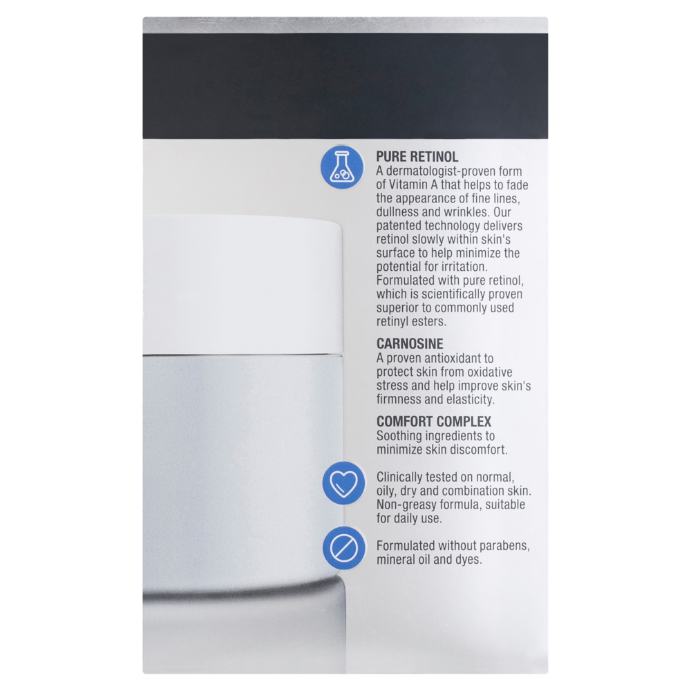 For Retinol beginners, gradually phase retinol into your skincare routine, start with 2-3 uses a week for the first 3 weeks, working up to daily use as tolerated. - IngredientsWater, Pentaerythrityl Tetraethylhexanoate, Glycerin, Dimethicone, PPG-15 Stearyl Ether, Butylene Glycol, Stearyl Alcohol, Cetearyl Alcohol, Glyceryl Behenate, Ceteareth-20, Isohexadecane, Zea Mays (Corn) Starch, Pentylene Glycol, Dimethicone Crosspolymer, Fragrance, Ammonium Acryloyldimethyltaurate/VP Copolymer, Caprylyl Glycol, Polyacrylamide, 4-t-Butylcyclohexanol, Sodium Polyacrylate, Chlorphenesin, Sodium Cocoyl Amino Acids, Carnosine, C13-14 Isoparaffin, Polysorbate 20, Retinol, Hydrolyzed Myrtus Communis Leaf Extract, Disodium EDTA, Pentaerythrityl Tetra-di-t-butyl Hydroxyhydrocinnamate, Sodium Hyaluronate, Laureth-7, Ascorbic Acid, Sarcosine, Sodium Hydroxide, Magnesium Aspartate, Potassium Aspartate, Portulaca Oleracea Extract.