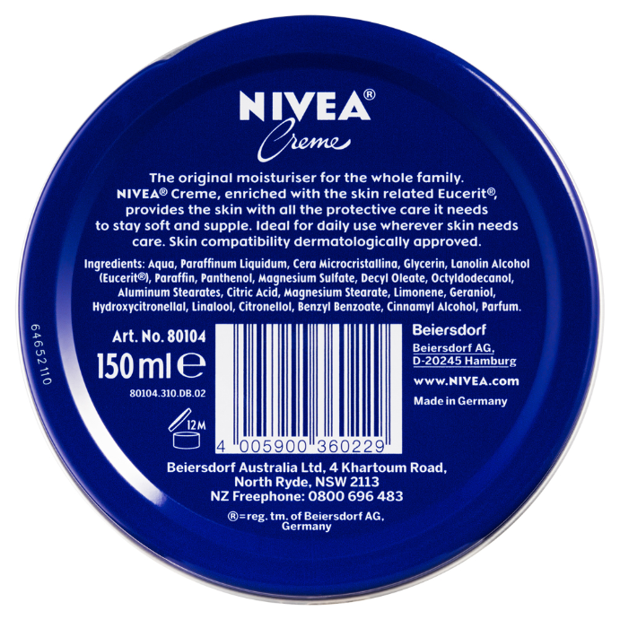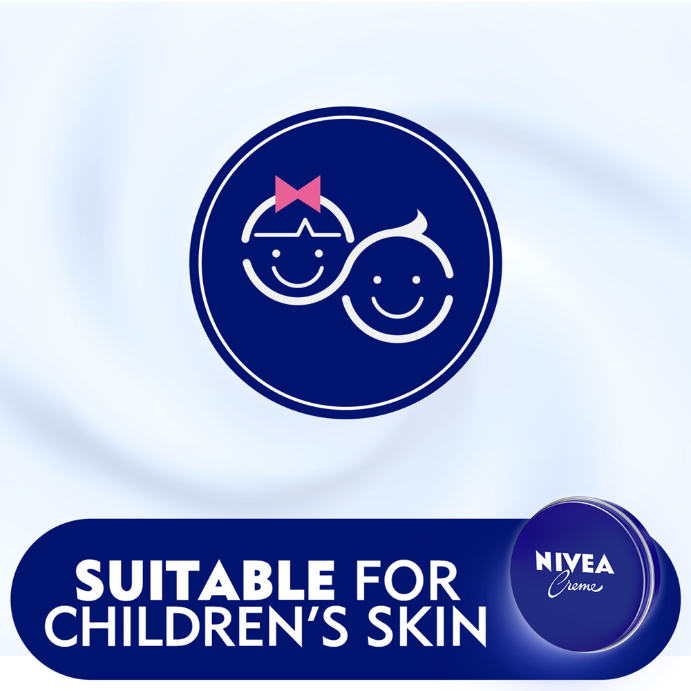 - What it doesNIVEA Crème is the original moisturiser for the whole family. This iconic cream is built on 100 years of trusted NIVEA skincare expertise. Enriched with the skin related Eucerit®, NIVEA Crème provides the skin with all the protective care it needs to stay soft and supple. Ideal for daily use whenever and wherever your skin needs a little extra care - face, hands, body, you name it! This lotion hydrates and soothes the skin with each use, providing intense moisture for every skin type, even sensitive skin. The skin compatibility of this moisturiser has been dermatologically tested and approved.