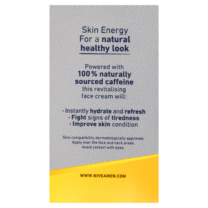 - What it doesNIVEA Men Active Energy Moisturiser cares for men's skin intensely without leaving any residue. Made with quality energising ingredients, such as 100% Naturally Sourced Caffeine and Vitamin+ Complex, this face cream works to hydrate and refresh the skin. It fights signs of tiredness and provides long lasting vitalisation to provide healthy looking skin. The fast-absorbing, non-sticky formula helps improve skin condition and instantly provides the skin with refreshing moisture. Simply apply all over your face and neck, avoiding the eye and lip areas. The skin compatibility of this revitalising face cream has been dermatologically approved.