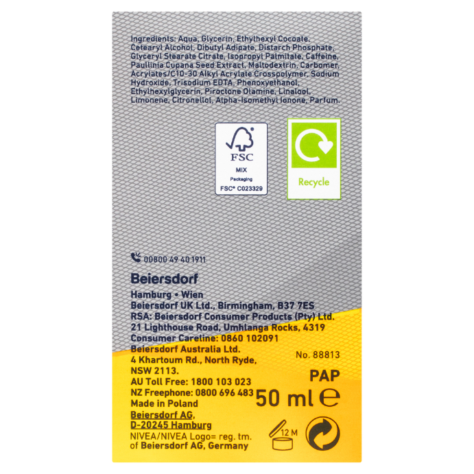 - IngredientsAqua, Glycerin, Ethylhexyl Cocoate, Cetearyl Alcohol, Dibutyl Adipate, Distarch Phosphate, Glyceryl Stearate Citrate, Isopropyl Palmitate, Caeine, Paullinia Cupana Seed Extract, Maltodextrin, Carbomer, Acrylates/C10-30 Alkyl Acrylate Crosspolymer, Sodium Hydroxide, Trisodium EDTA, Phenoxyethanol, Ethylhexylglycerin, Piroctone Olamine, Linalool, Limonene, Citronellol, Alpha-Isomethyl Ionone, Parfum.