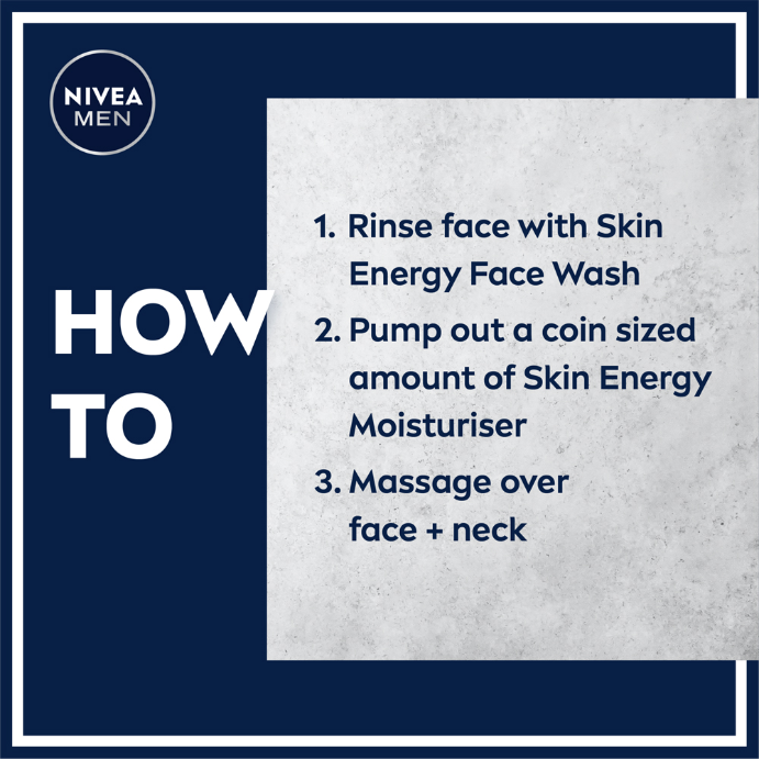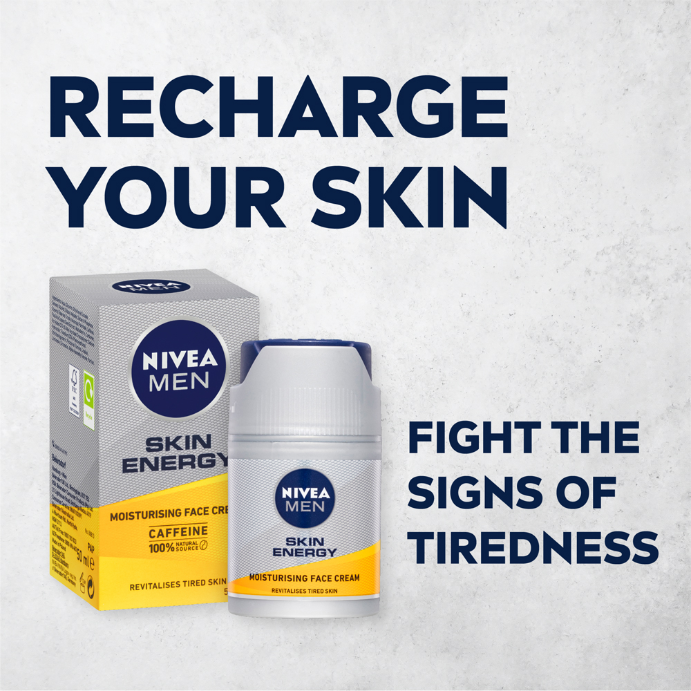 - What it isWake up right with NIVEA Men Active Energy Moisturiser. Powered with Caffeine and Vitamin+ Complex, this moisturiser instantly hydrates and refreshes the skin. The fast absorbing and non-sticky formula helps to improve the skin's condition so you can look and feel energised.