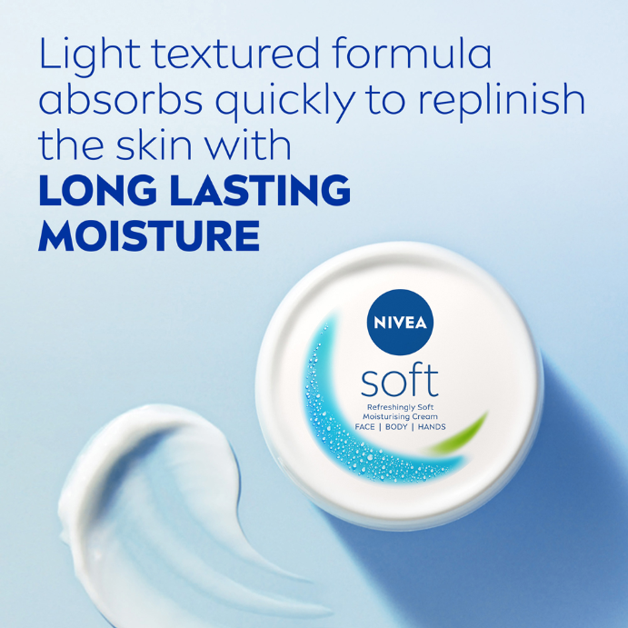 - What it doesNIVEA Soft all-purpose moisturiser with Vitamin E and Jojoba Oil is a highly effective, intensive moisturising cream for everyday use. The lotion's light texture is ideal for all skin types - from dry to sensitive - always giving you the most refreshing feeling. The compact pot makes it perfect for easy, everyday application anywhere you want. This fantastic formula is quickly absorbed to replenish the skin, provides you with a long-lasting soft touch and leaves your skin feeling soft and supple. NIVEA Soft is pH. neutral & dermatologically approved to provide the best everyday moisture for your face, hands & body.