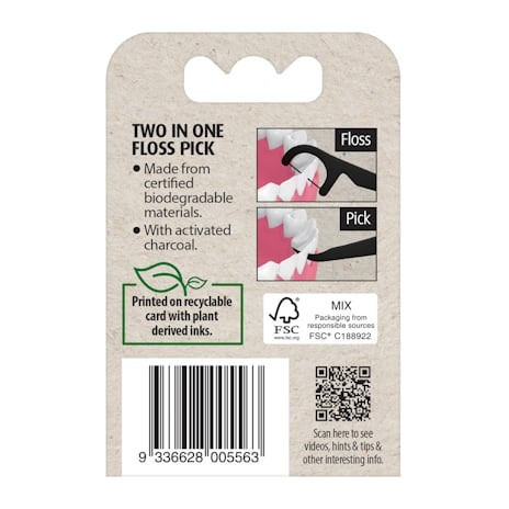 Biodegradable floss picks made with activated charcoal for a fresher, cleaner mouth.