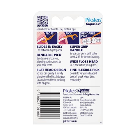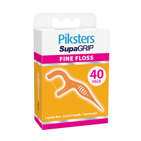 Piksters SupaGRIP Floss Picks are designed to make flossing faster, easier and more effective. Each pick combines a strong, low-friction floss tape with a built-in toothpick tip, so you can remove plaque and trapped food from between your teeth using a single, easy-to-hold device.