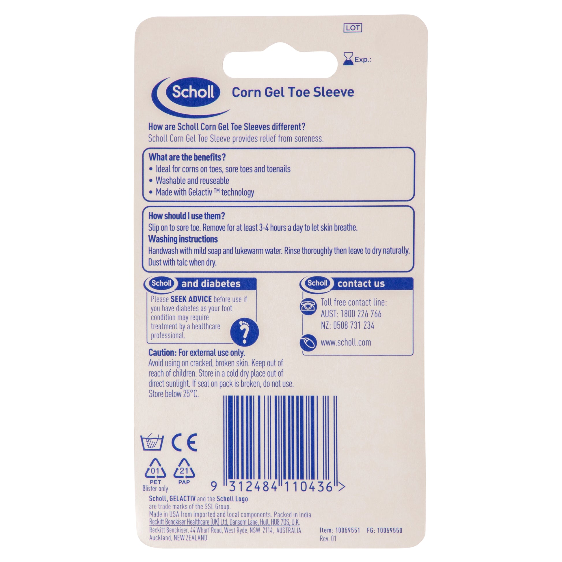 - What it isScholl Corn Gel Toe Sleeve with Cushioning Protection provides immediate relief from pressure & rubbing, making it ideal for corns and sore spots on toes.
