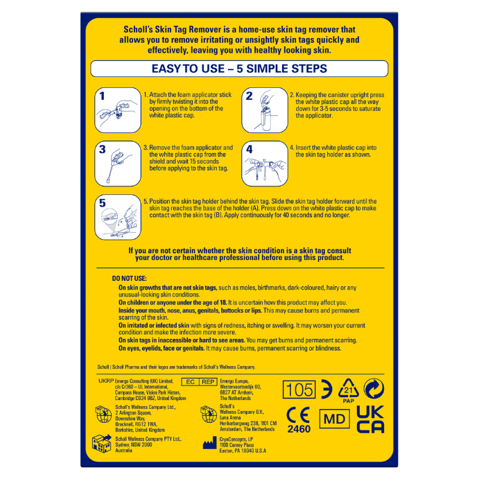 Remove bothersome and unsightly skin tags in the privacy of your own home with Scholl's easy to use, one-handed precision applicator. Leveraging the same cryotherapy freezing method used by doctors worldwide, you can remove skin tags in 5 simple steps, it only takes 40secs!
