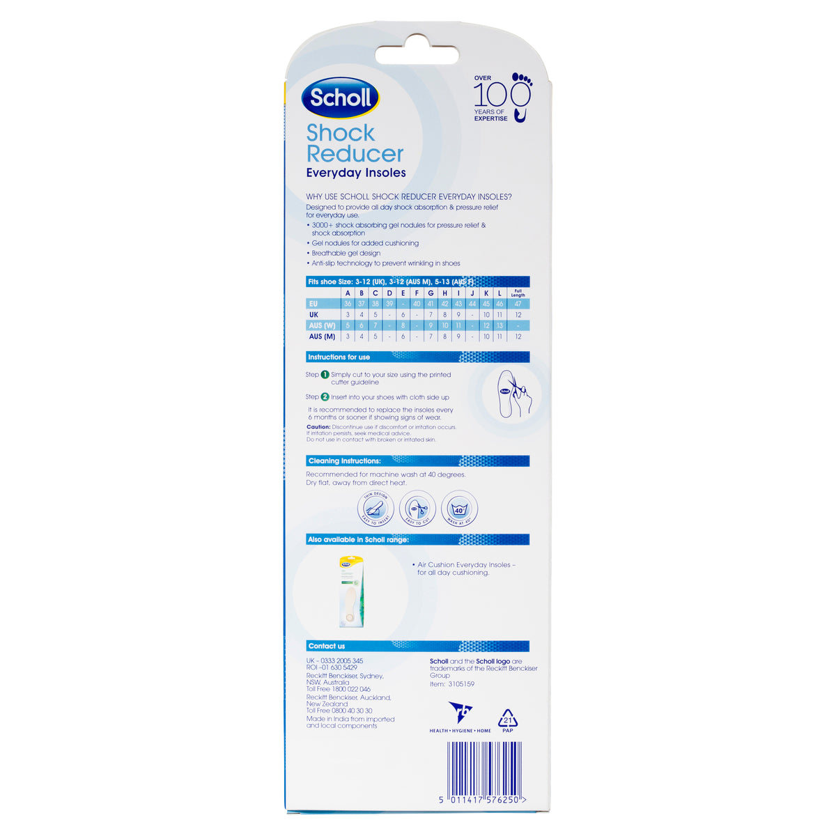 - What it isScholl Shock Reducer Everyday Insoles designed to provide all day shock absorption and pressure relief for everyday use.