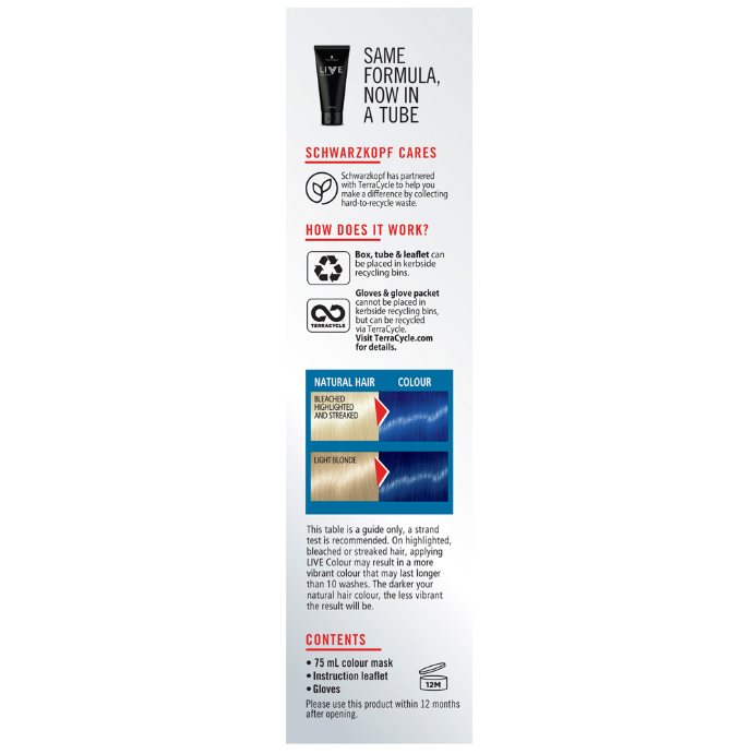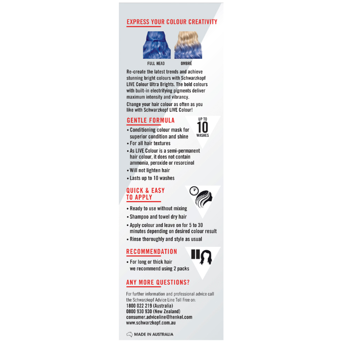 What it doesChange your hair colour as often as you like with Schwarzkopf LIVE Colour Ultra Brights! Express your colour creativity and re-create the latest trends with stunning bright hair and maximum colour intensity for up to 10 washes. The gentle and vegan formula* does not contain ammonia, peroxide or resorcinol and the conditioning colour mask provides superior condition and shine. Ready to use without mixing - quick and easy to apply. Now in a resealable tube with 2x more product for multiple uses.
