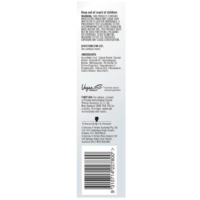 - Warning & PrecautionsThis product contains ingredients which may cause skin irritation to certain individuals. A preliminary test according to the accompanying directions should be made before use. This product must not be used for dyeing eyelashes or eyebrows. To do so may be injurious to the eye. Repeated exposure may cause sensitisation. Keep out of reach of children.