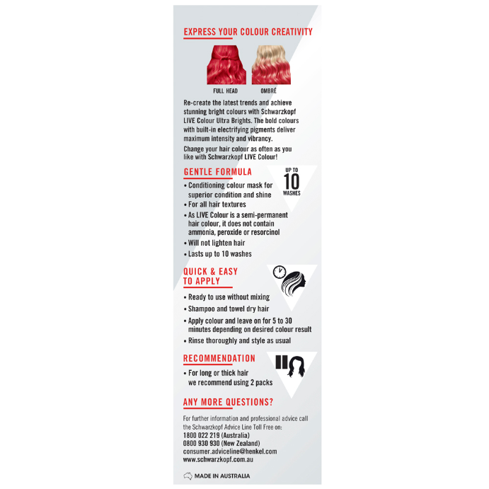 What it doesChange your hair colour as often as you like with Schwarzkopf LIVE Colour Ultra Brights! Express your colour creativity and re-create the latest trends with stunning bright hair and maximum colour intensity for up to 10 washes. The gentle and vegan formula* does not contain ammonia, peroxide or resorcinol and the conditioning colour mask provides superior condition and shine. Ready to use without mixing - quick and easy to apply. Now in a resealable tube with 2x more product for multiple uses.