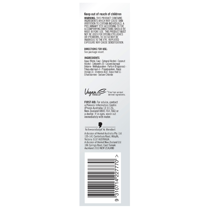 - Warning & PrecautionsThis product contains ingredients which may cause skin irritation to certain individuals. A preliminary test according to the accompanying directions should be made before use. This product must not be used for dyeing eyelashes or eyebrows. To do so may be injurious to the eye. Repeated exposure may cause sensitisation. Keep out of reach of children.