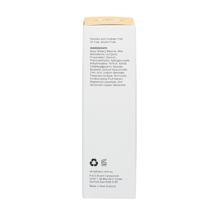 - IngredientsAqua (Water), Betaine, Aloe Barbadensis Leaf Juice, Propanediol, Glycerin, Phenoxyethanol, Xylitylglucoside, Anhydroxylitol, Parfum, Xylitol, Ethylhexylglycerin, Glucose, Bisabolol, Sodium Hyaluronate, Citric Acid, Sodium Benzoate, Potassium Sorbate, Terminalia Ferdinandiana Fruit Extract, Magnesium Aspartate, Zinc Gluconate, Copper Gluconate.