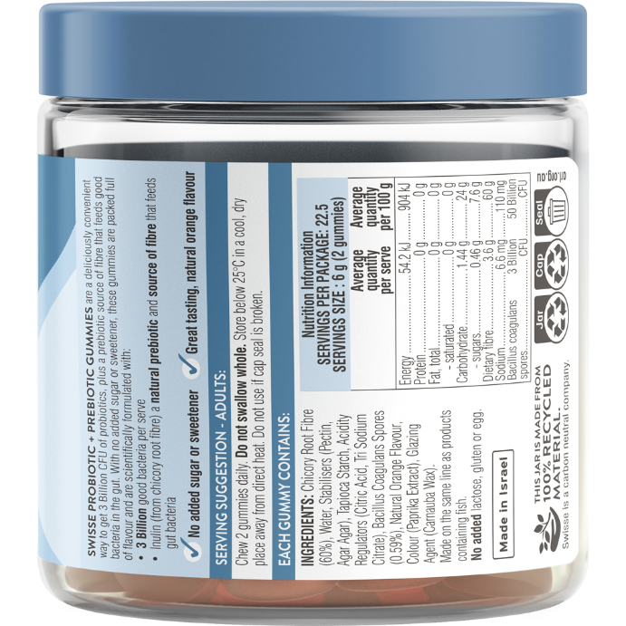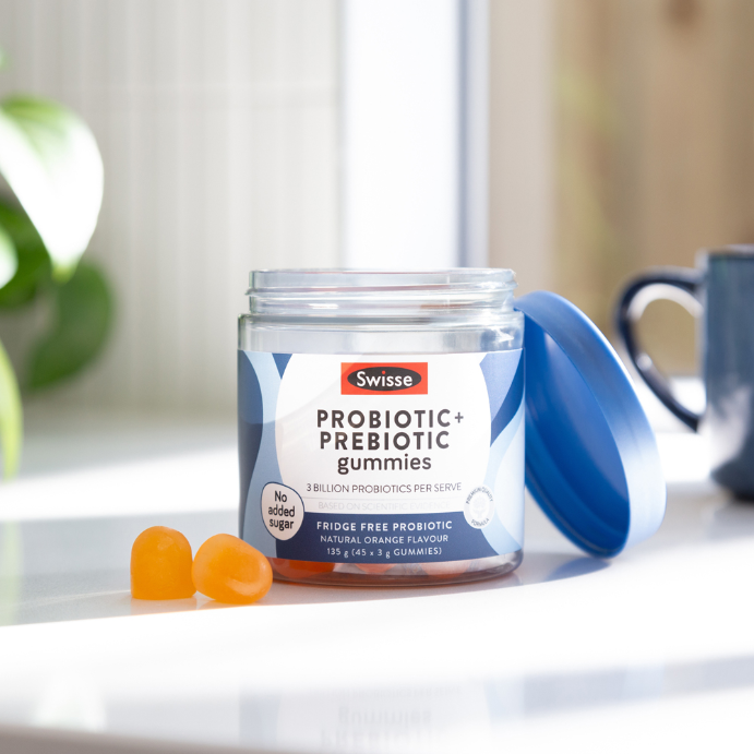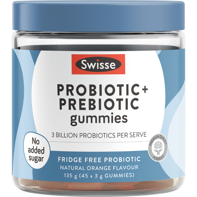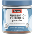 - What it isLooking for a delicious way to add probiotics and prebiotics to your diet? Swisse Probiotic + Prebiotic Gummies contain 3 billion CFU of probiotics per serve, plus inulin (from chicory root), a natural prebiotic and a source of fibre to feed the good bacteria in your gut.
