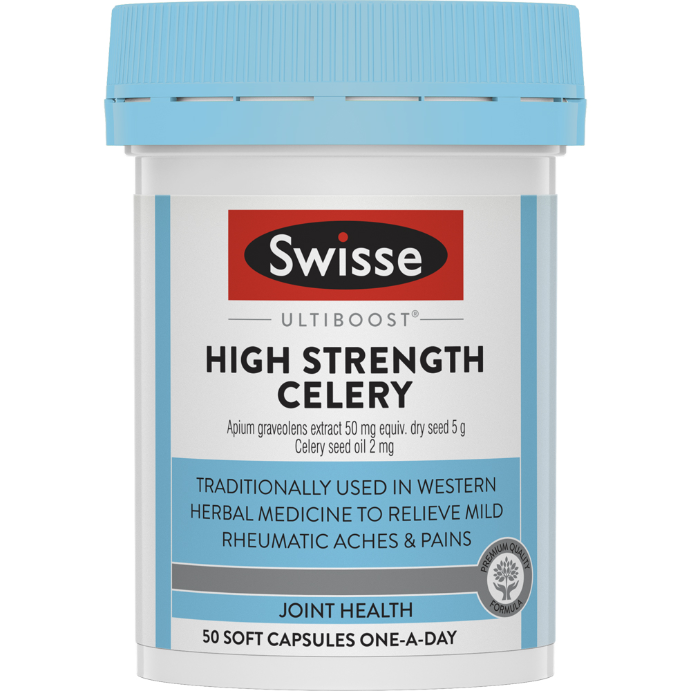 - What it isSwisse Ultiboost High Strength Celery is developed based on traditional evidence to relieve mild rheumatic pain. Apium graveolens extract & Celery seed oil are traditionally used in Western Herbal Medicine to relieve mild rheumatic pain.