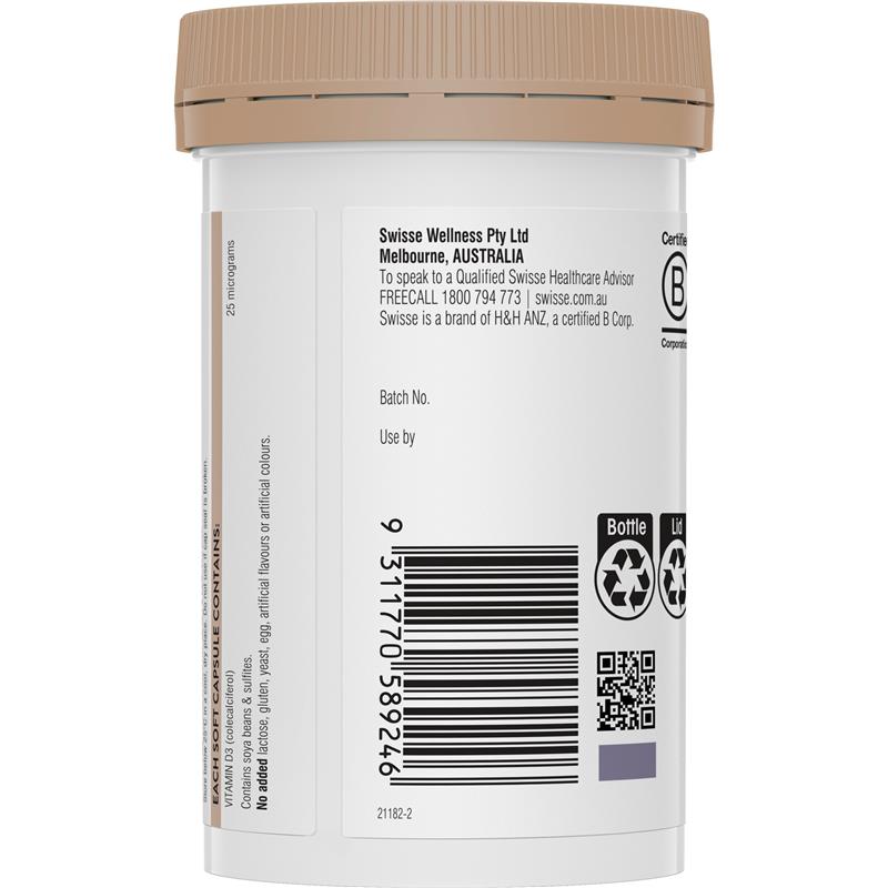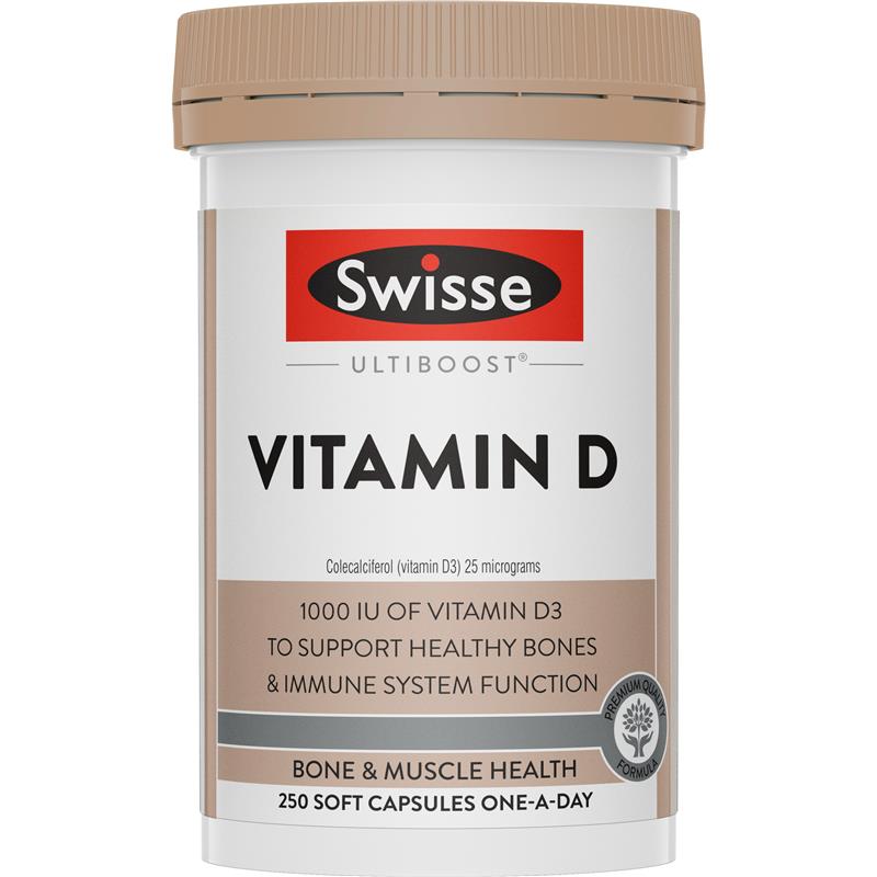 Swisse Ultiboost Vitamin D is a premium quality formula that maintains healthy bones and teeth, bone density supports the absorption of dietary calcium, and maintains immune system health and function. Vitamin D is produced by the body when it’s exposed to sunlight, however inadequate sun exposure can sometimes mean our body’s vitamin D levels are low – in fact, nearly one quarter of Australian adults are deficient in vitamin D*. This supplement contains 25 micrograms of vitamin D3, which is retained in the bloodstream more effectively when compared to vitamin D2 (a synthetic form).*Australian Health Survey: Biomedical Results for Nutrients, 2011-12