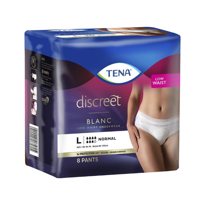 TENA Women's Discreet Low Waist Blanc incontinence underwear have a stylish low waist design with micro-stretch fabric that make them look and feel just like regular underwear.