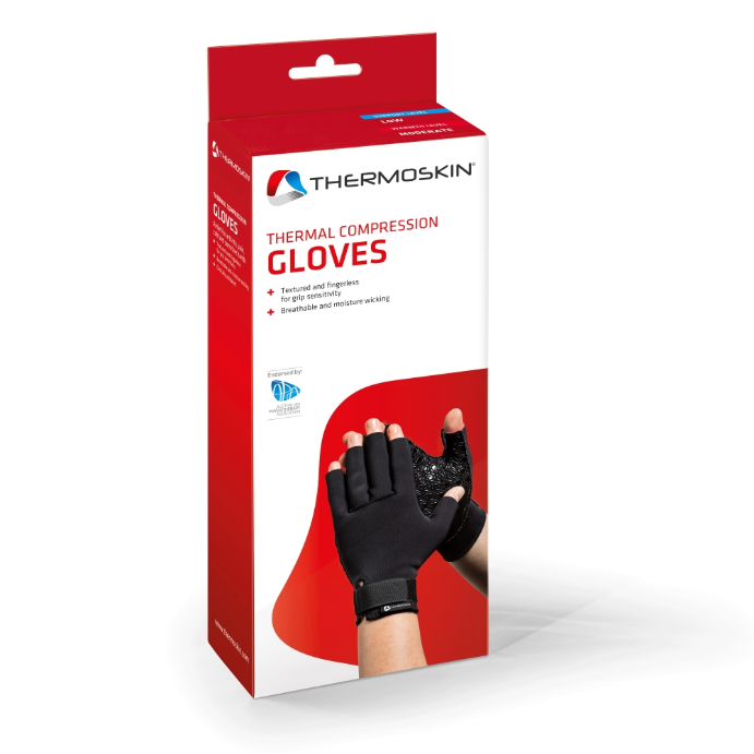 - What it doesShaped for comfort, the Thermal Compression Gloves provide warmth and even compression for the temporary relief of arthritic pain. Designed for everyday use, the textured palms and fingertip cut outs provide additional grip and a better sense of touch so you can get on with your day-to-day without restriction.
