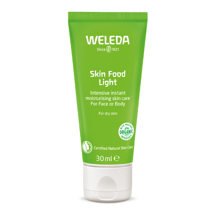 - What it doesSkin Food Light provides intensive, instant moisture to dry skin on face or body. This light, quickly-absorbed lotion, combines organic sunflower oil with skin-calming extracts of pansy, chamomile and calendula. Your skin feels the loving care of immediate moisture, while the light formulation regenerates the skin's own protective barrier, protecting it from drying out. Nourishing organic shea and cocoa butters complete the formula leaving your skin feeling smooth and silky soft. The unique scent of sweet orange, aromatic lavender and warm vanilla notes indulge your soul. This smaller size is your ideal companion when you are on the go!